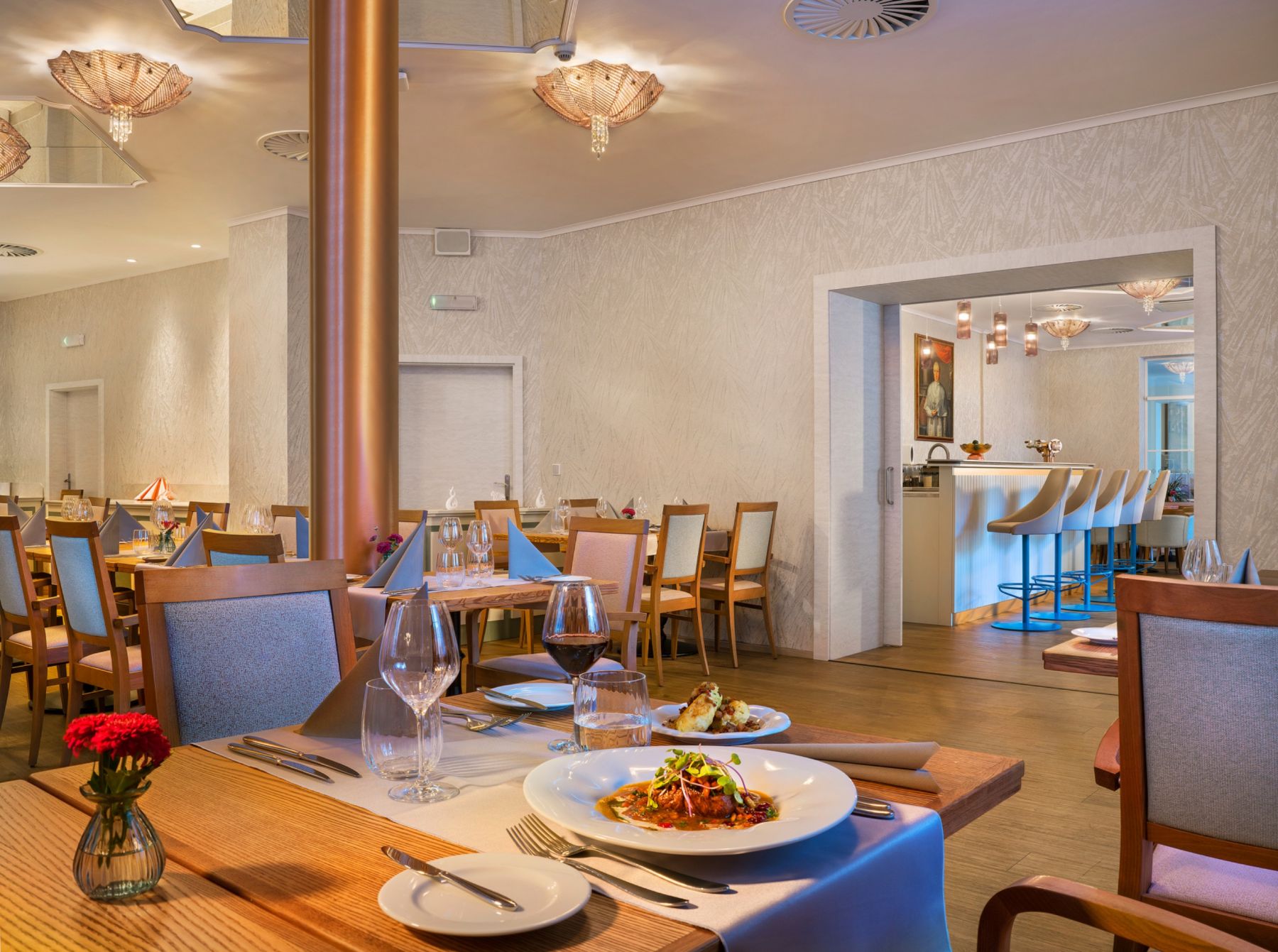 Wir sorgen für Ihre großartigen gastronomischen Erlebnisse. Unsere höchste Priorität ist die Zusammenarbeit mit lokalen Lieferanten und die Zubereitung von hochwertigem Essen. Im Speisesaal servieren wir Frühstück und Abendessen in Buffetform sowie ein leichtes Mittagessen à la carte (Auswahl aus Tagessuppen und Salaten).