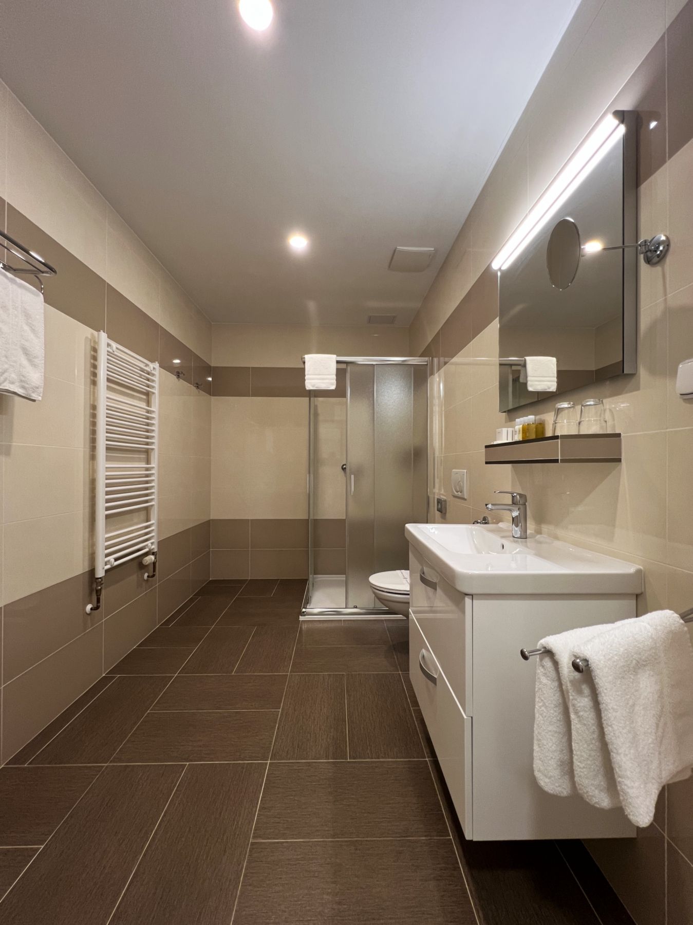 To make your stay feel comfortable as possible, we offer a number of individual room modifications – softening of the bed, extra blankets or the possibility of raising the hight of the toilet seat. Write us your wishes directly when booking and everything will be ready upon arrival. For a pleasant transition to relaxation in the wellness centre, we have prepared a bathrobe, slippers and a wellness bag for your stay.